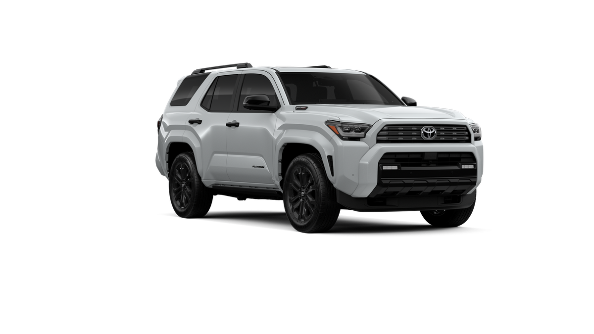 - Dark-chrome tri-bar grille; gloss-black mirror caps and door handles; color-keyed overfenders and rear spoiler; gloss-black "PLATINUM" and "4RUNNER" badges